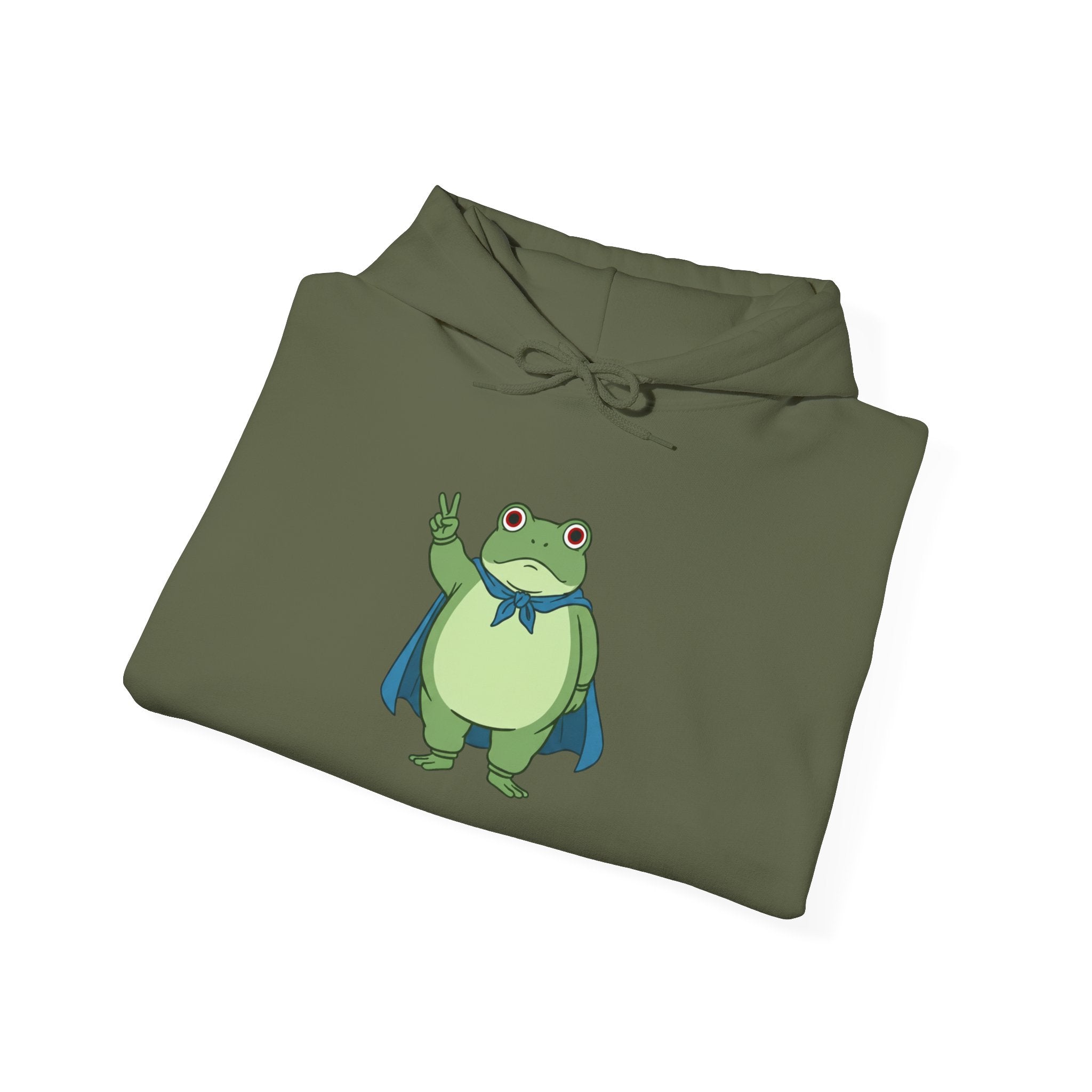 This isn’t just a hoodie—it’s a tribute to inflatable absurdity. Red eyes. Blue cape. Downturned mouth. The frog who danced through pepper spray and still looked unimpressed.