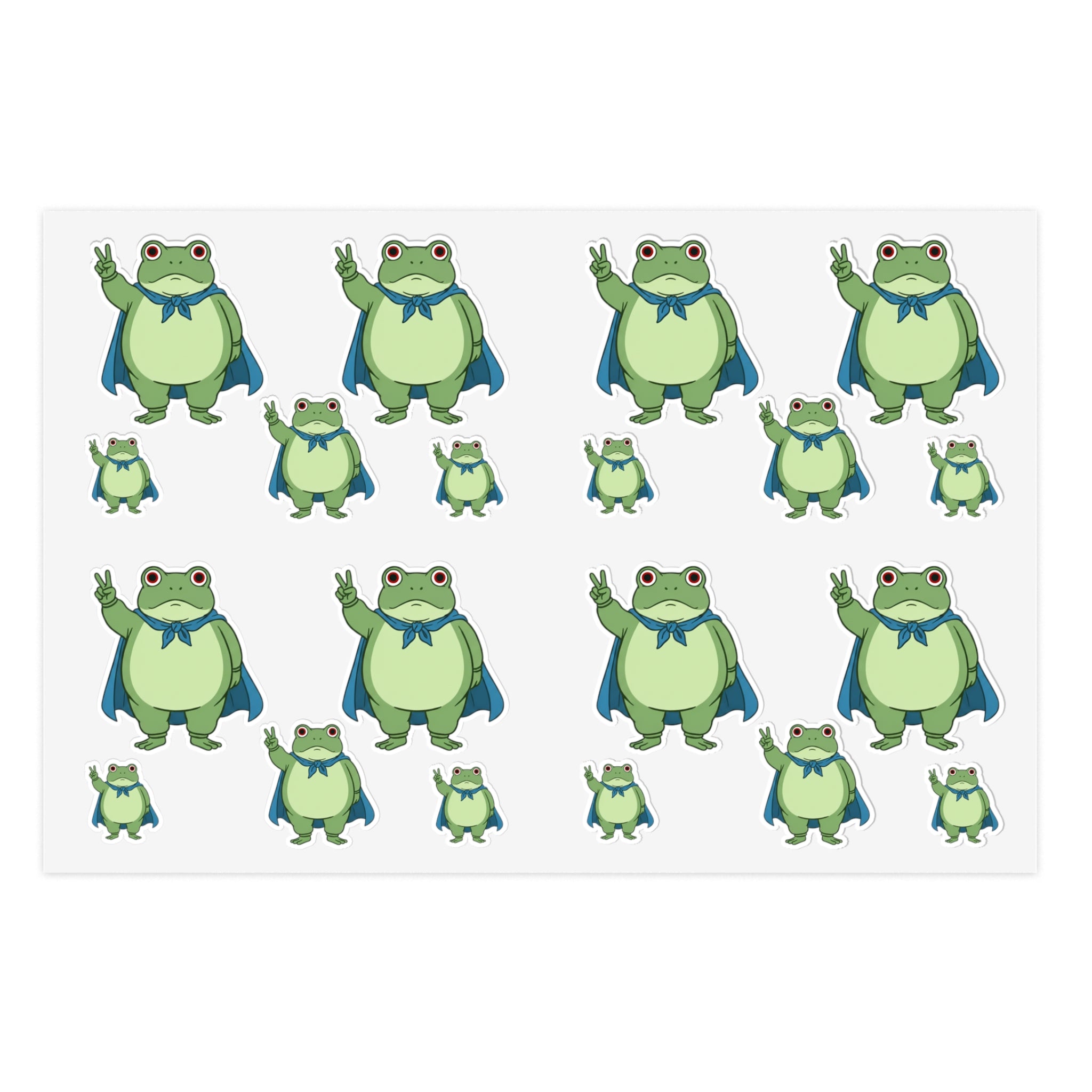 This isn’t just a sticker sheet—it’s a tribute to inflatable absurdity. Red eyes. Blue cape. Downturned mouth. The frog who danced through pepper spray and still looked unimpressed.