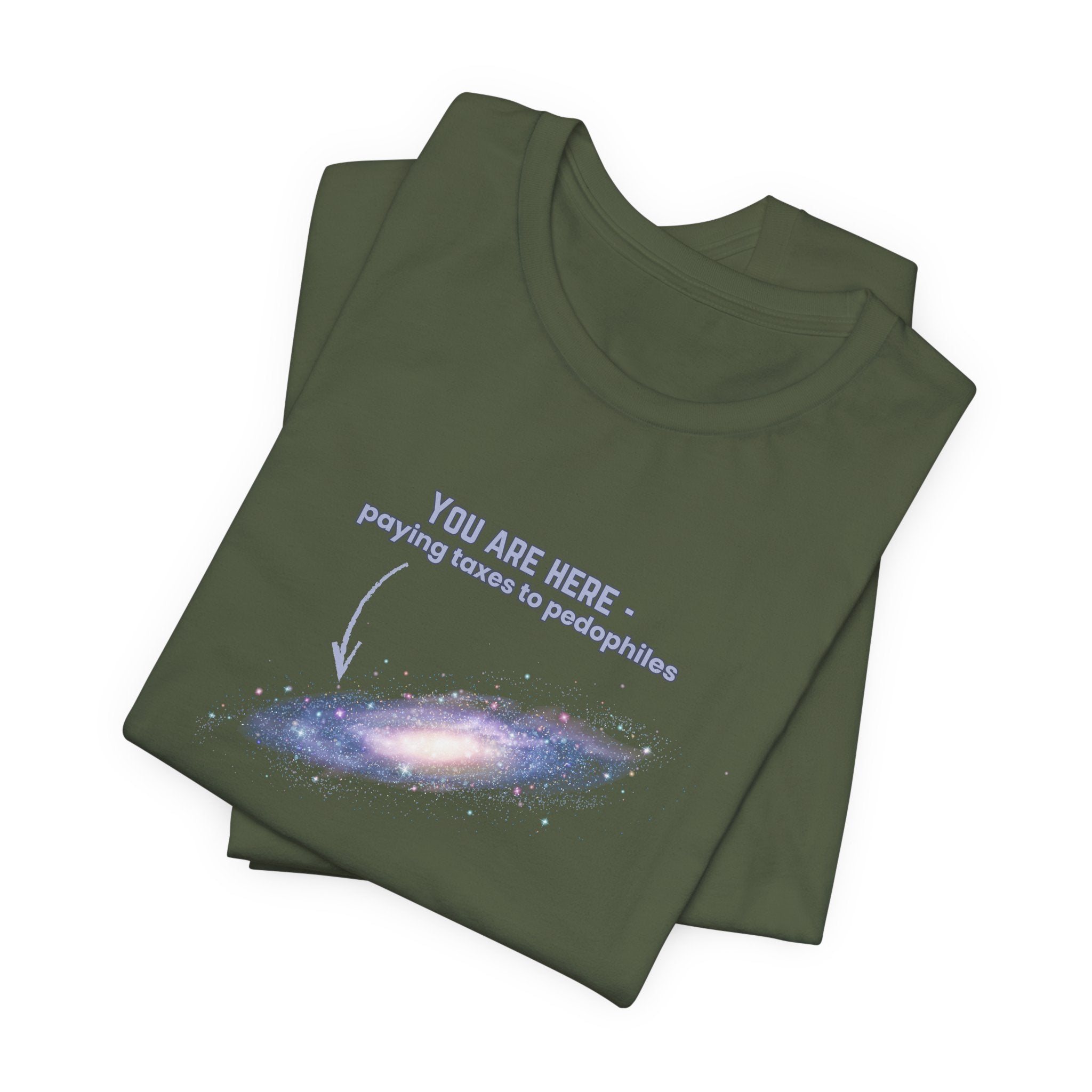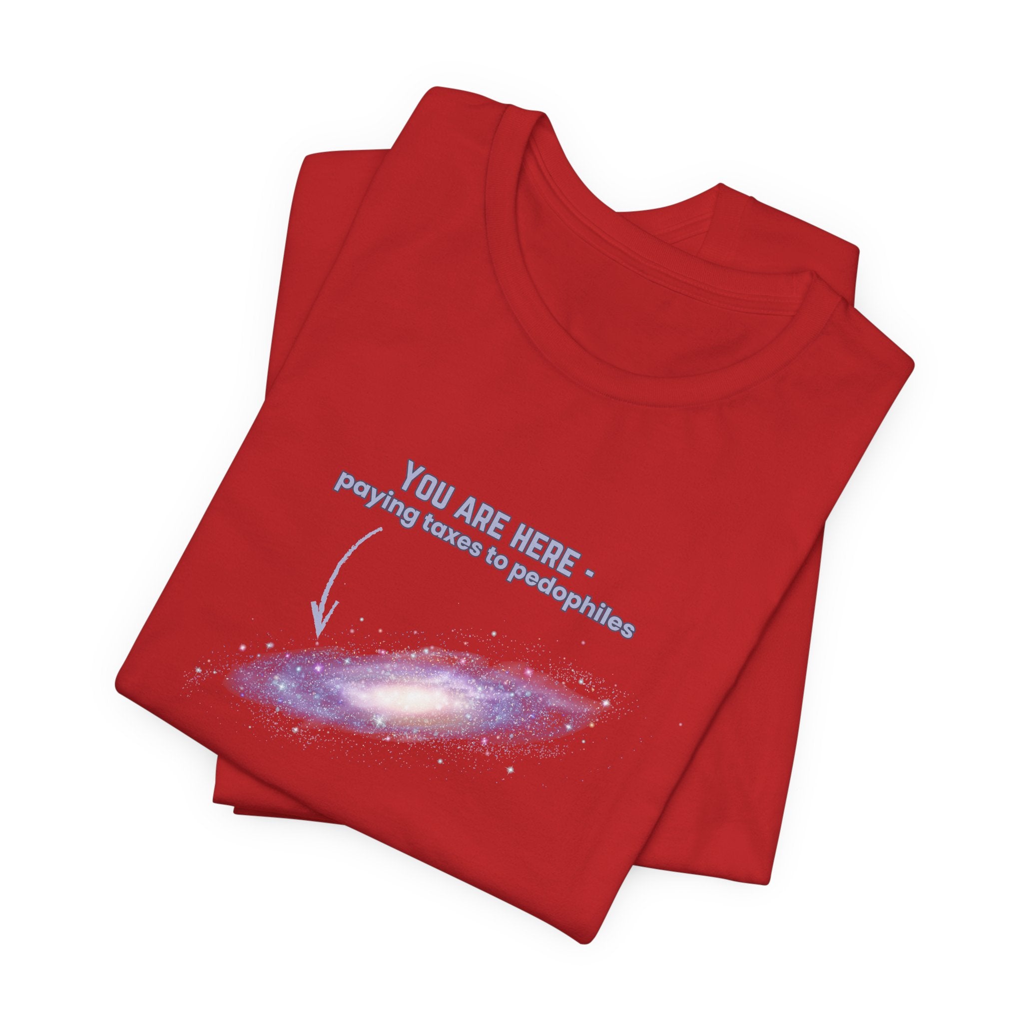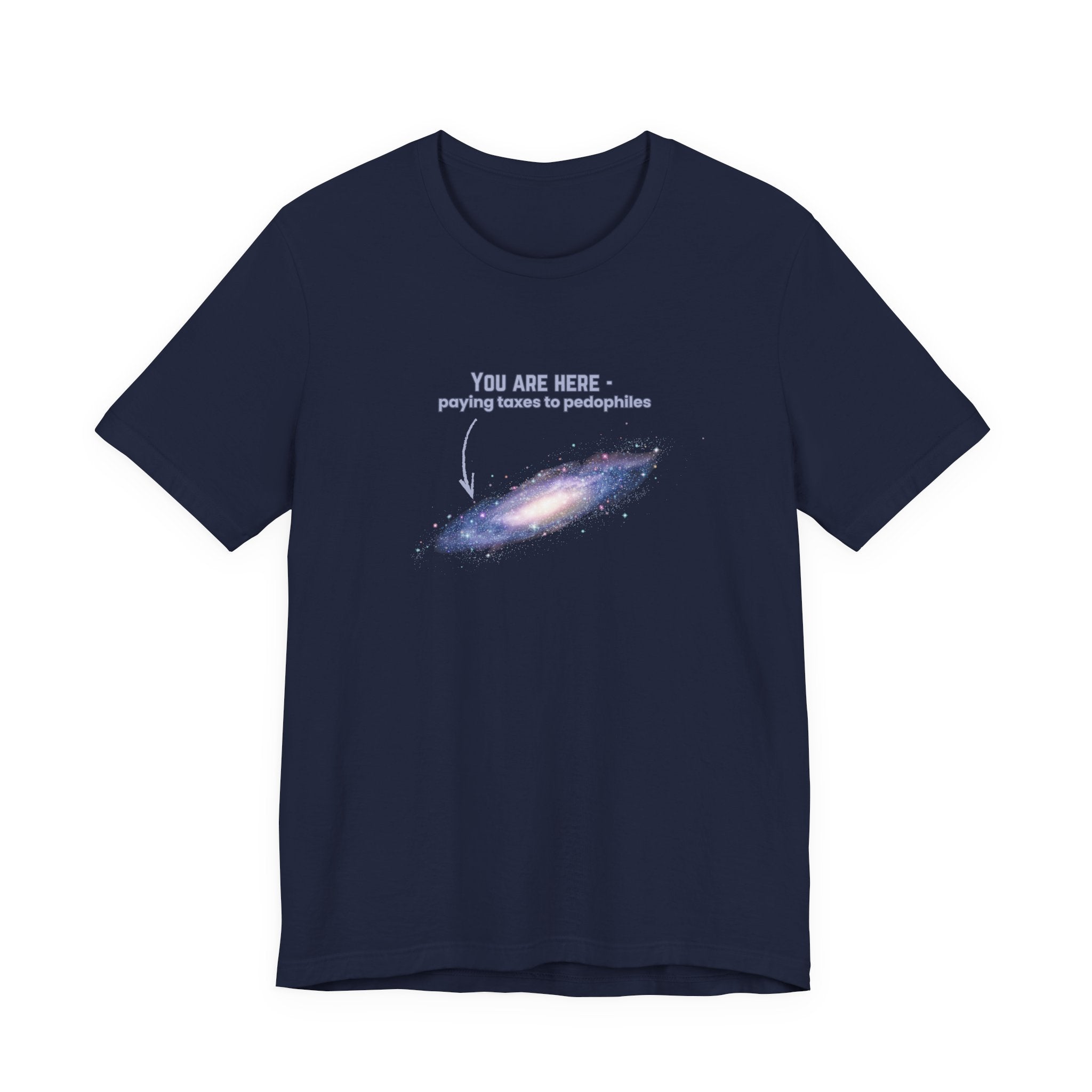 The "You Are Here" T-shirt features a striking graphic of the Milky Way galaxy—the ultimate "map" of our existence—paired with a biting, unapologetic reality check: "you are here - paying taxes to pedophiles." This design is for the "Radical Left Scum" and the "Nuisance to the Status Quo" who refuse to look away from the corruption of the elite. It’s a critique of a system that demands our labor while protecting those who exploit the most vulnerable. When you wear this, you aren't just wearing a galaxy; you are wearing a demand for accountability and a refusal to fund a broken system in silence.